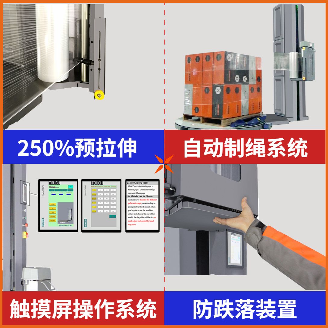 b.自動(dòng)制繩系統(tǒng) 自動(dòng)制繩技術(shù)是將纏繞膜底部約10公分卷成一股繩,可以代替?zhèn)鹘y(tǒng)打包帶使貨物更緊;