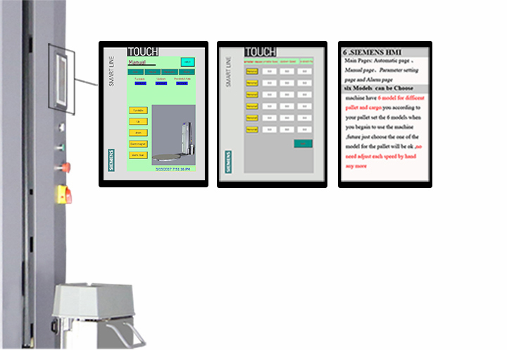 對(duì)于一些比較重且厚實(shí)的貨物,像水泥、塑膠顆粒等袋裝碼垛貨物,我們可以把包緊力稍微調(diào)大一點(diǎn),這樣可以使此類(lèi)貨物不會(huì)輕易滑落造成事故;對(duì)于一些紙箱類(lèi)貨物,像紙巾、電子產(chǎn)品,我們需要把包緊力調(diào)小一點(diǎn),若設(shè)置過(guò)大的話,紙箱邊緣會(huì)被擠壓變形,影響產(chǎn)品美觀或功能;對(duì)于一些很輕很小件的貨物,我們需要把圓盤(pán)的旋轉(zhuǎn)速度調(diào)小一點(diǎn),讓它轉(zhuǎn)得慢一點(diǎn),以避免在旋轉(zhuǎn)過(guò)程中上層貨物因離心力太大而滑落。