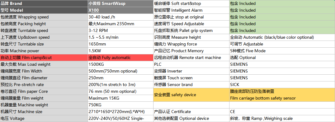先放一張圖,圖中是小黃蜂X100全自動(dòng)纏繞機(jī)的參數(shù)配置,通過(guò)圖我們可以看到上面有很多參數(shù)介紹,那我們就來(lái)了解一下。